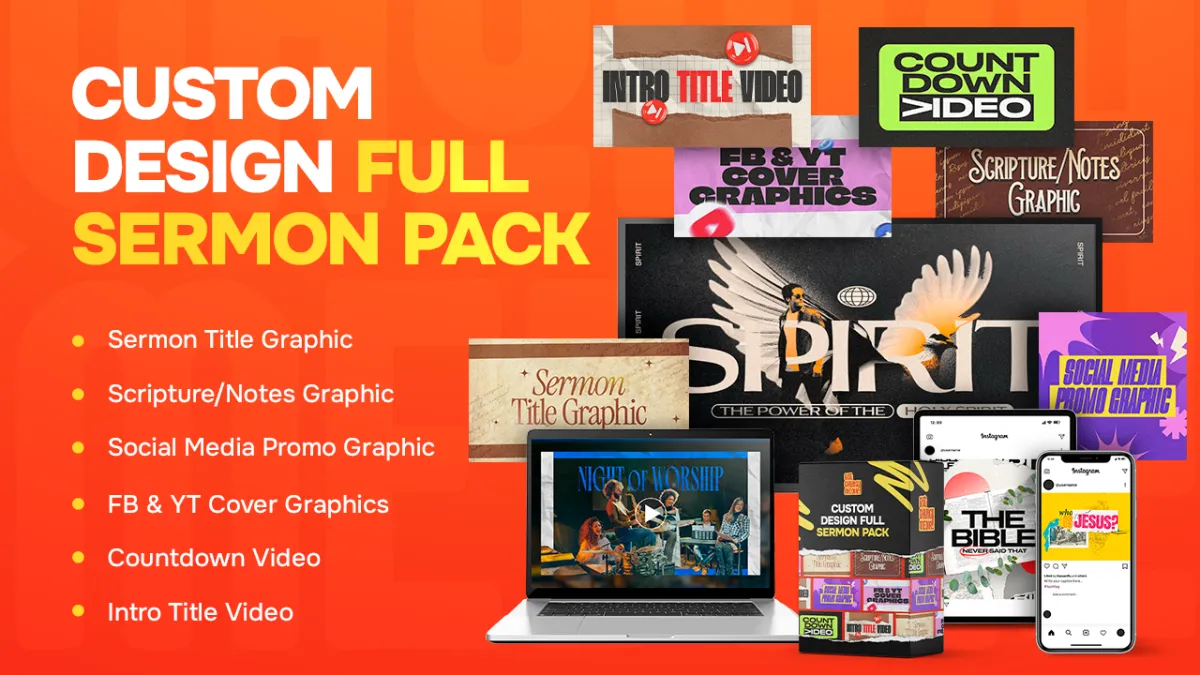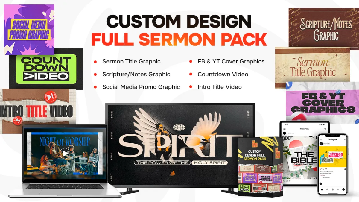 The Custom Church Sermon Pack is the fastest way to get professional, custom-designed church media tailored to YOUR sermon without lifting a finger.